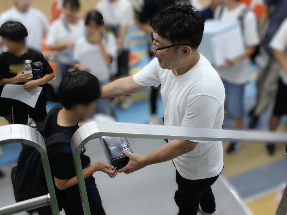 廣橋会長と青少年奉仕 岡委員長より「ロータリークラブ」とはどんな団体かを説明して、ボールの持ち方、ルールー説明後ゲーム開始!!