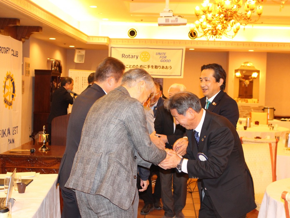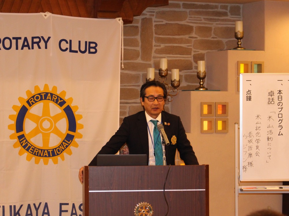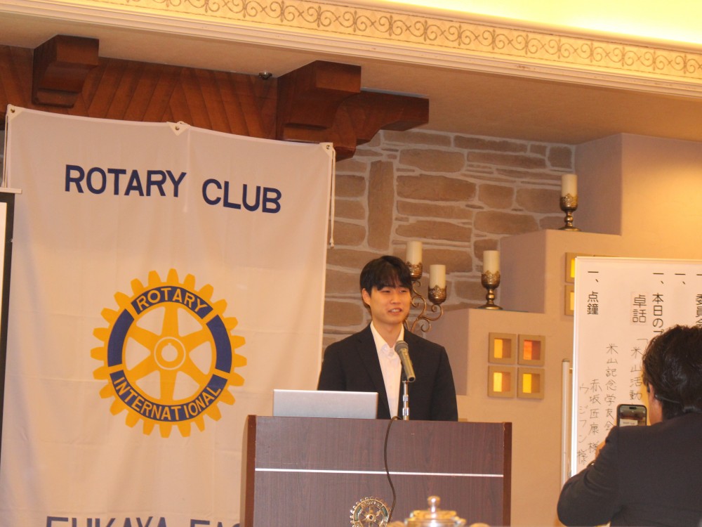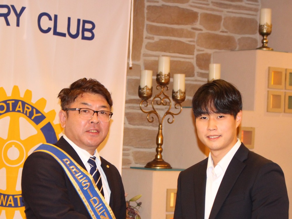 - 10 月は米山月間ということで米山記念奨学生派遣地区役員 赤坂匠康様、米山記念奨学生 禹 知勲(愛称:ジン)君にお越しいただきました。